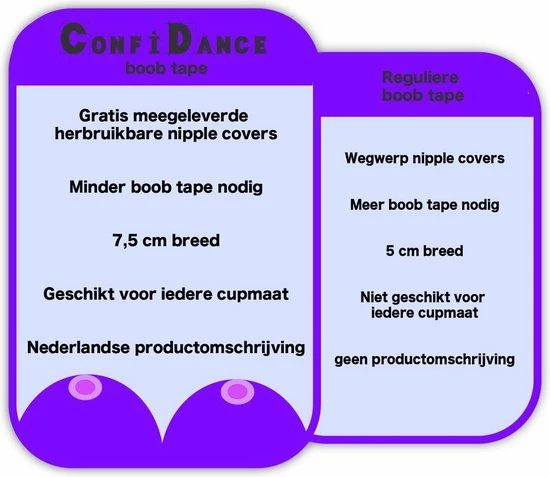 Met de ConfiDance boobtape kan je uren dansen, springen en rennen. De tape blijft tot 9 uur lang zitten en door de elastische tape rekt de tape goed mee. De ConfiDance boobtape is water- en zweetbestendig dus als je gaat zweten komt de tape niet los te zitten. Weet je van jezelf dat je een gevoelige huid hebt? Dan is de boobtape niet de meest geschikte oplossing en kan je beter kijken naar tepelplakkers of een dieper uitgesneden BH.
