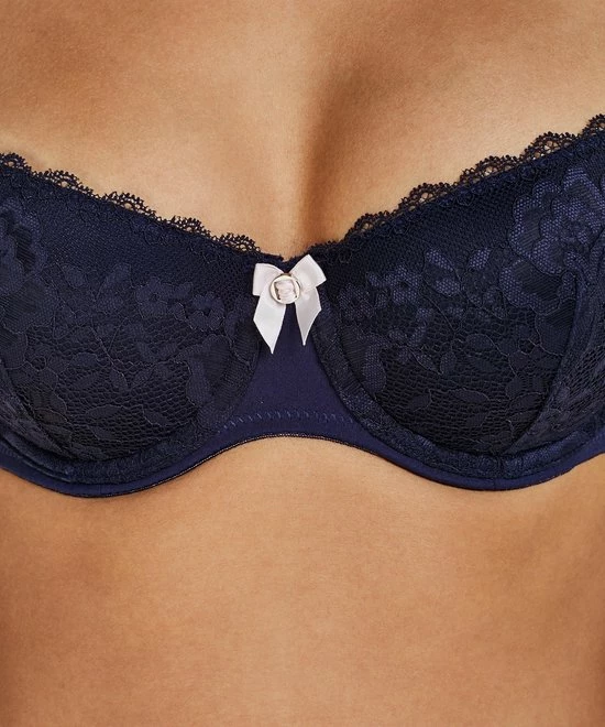 De cups van deze voorgevormde beugel bh zijn bedekt met prachtig kant. De bh is afgewerkt met subtiele details zoals het strikje tussen de cups en op de schouderbandjes. Deze bh is te combineren met de bijpassende slip.