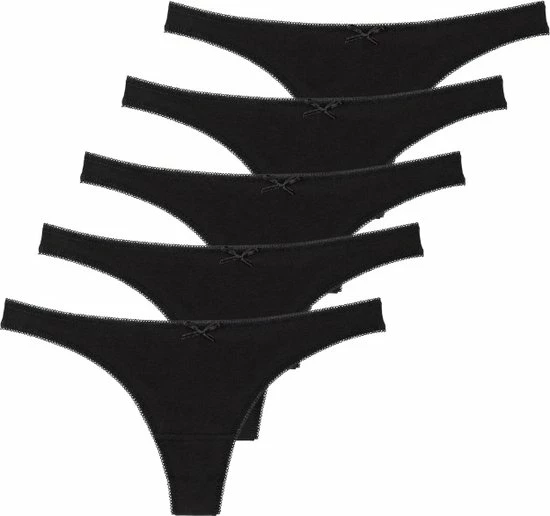 Set van 5 comfortabele basic damesstrings in de kleur zwart. De string heeft een fijne materiaalsamenstelling van zacht katoenmix met stretch, dat zorgt ervoor dat de string perfect aansluit op het lichaam en nauwelijks opvalt onder nauwsluitende kleding. De string is voorzien van een katoenen kruisje en een leuk decoratief strikje aan de bovenkant. Dames ondergoed van katoen is comfortabel en soepel voor de huid en schuurt niet. Daarbij neemt het goed vocht op en blijft het daardoor langer fris. Deze strings zijn een onmisbare basic, ideaal voor dagelijks gebruik. De slips worden geleverd als set van 5 stuks en zijn verkrijgbaar in diverse maten.