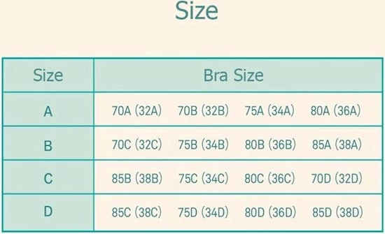 De BH is strapless en zonder bandjes. Zie onderstaande maat tabel om te achterhalen welke maat jij nodig hebt!