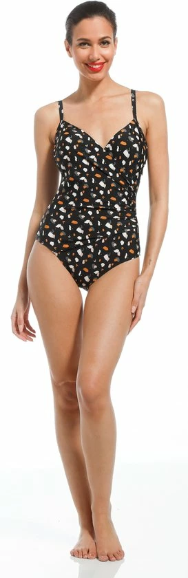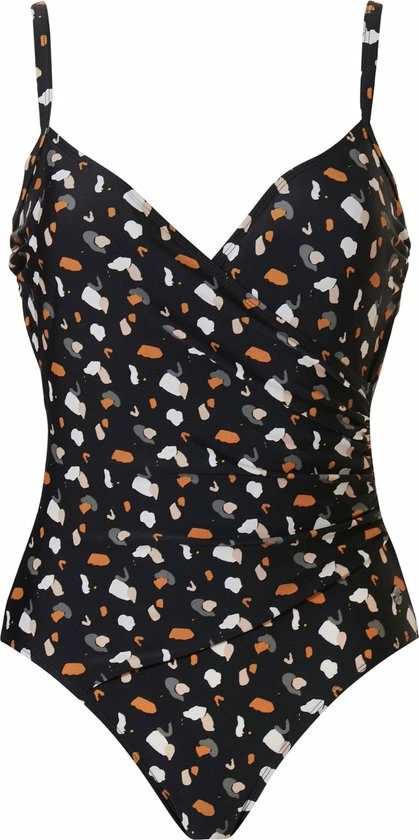 de basiskleur van het badpak is zwart en het heeft een speelse gevlekte print in verschillende kleuren, zoals wit, oranje en roze.