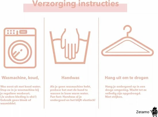 Na gebruik kan je het menstruatie ondergoed in een wetbag bewaren. Spoel het ondergoed uit met koud water voordat je het in de wasmachine stopt. Wassen mag in de wasmachine op 30°C. Gebruik geen bleekmiddel, wasverzachter of wasdroger, dit heeft invloed op het absorptievermogen.